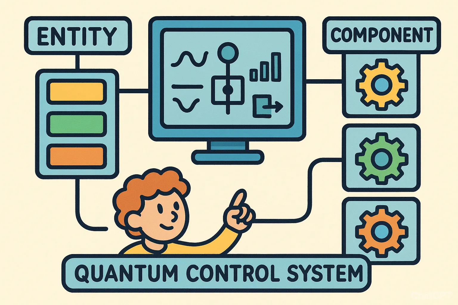 As usual, I started to ask ChatGPT for a visualization of the “Entity Component System applied to a quantum control system” (left) and its opposite, “quantum qubit controlled by an Entity Component System” (right). It’s hard to make any sense out of it, except for noticing that, in the first case, the “human” is the system, while in the second, the qubit seems to be the system.