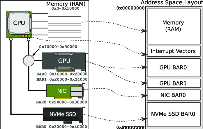 The defining feature of PCIe is that devices are mapped into the same address space as the CPU and system memory, as depicted with the figure on the right. Because this mapping exists, a CPU can read and write to device memory the same way it would access system memory. This is often referred to as memory-mapped I/O (MMIO).