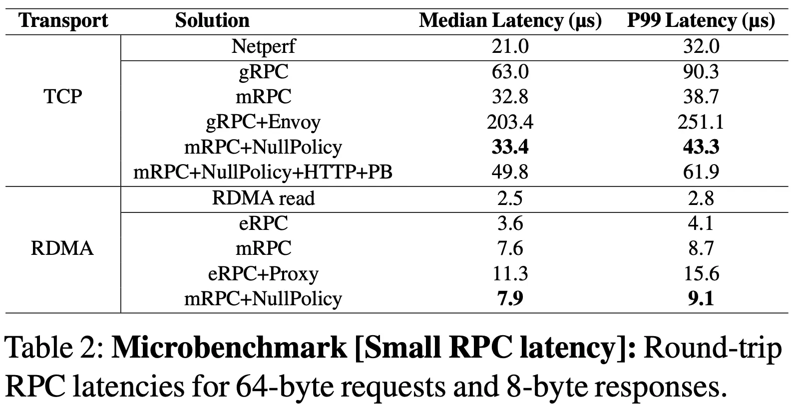 The good thing is that there is a lot of literature available on RPC over RDMA, such as mRPC, which presents very interesting latency numbers, based on the 100 Gbps Mellanox Connect-X5 RoCE NIC. There is confusion in the paper, as it states that “On RDMA, mRPC speeds up eRPC by 1.3× and 1.4× in terms of median and tail latency (respectively)” while the table indicates that eRPC is faster than mRPC. But, for now, one can assume that the latency numbers are empirically possible.