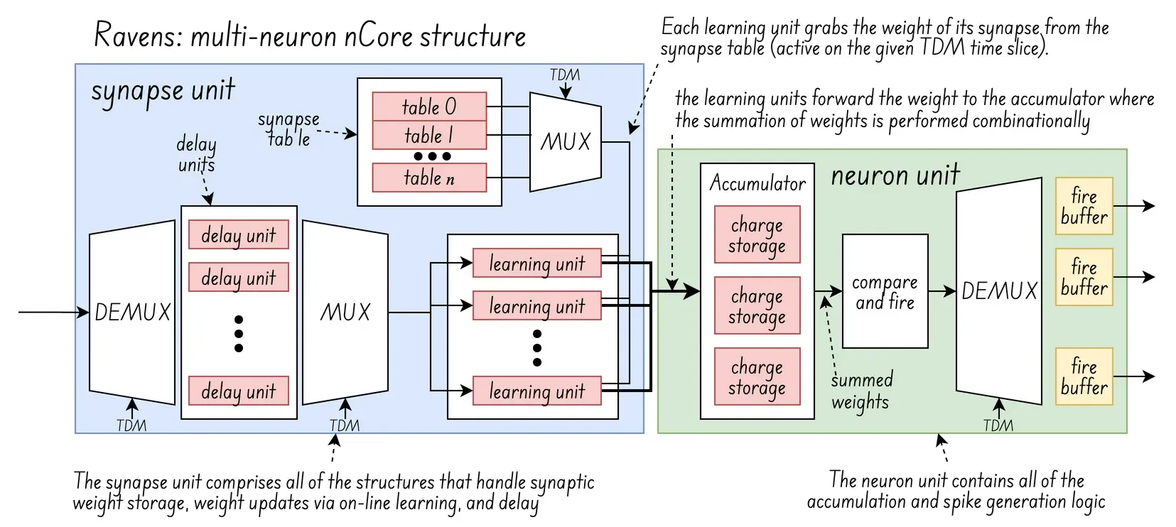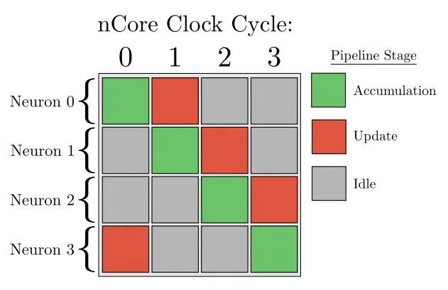 The idea behind RAVENS is to pipeline several “virtual neurons” using time-division multiplexing (TDM), in a two stage process consisting of accumulation and update.