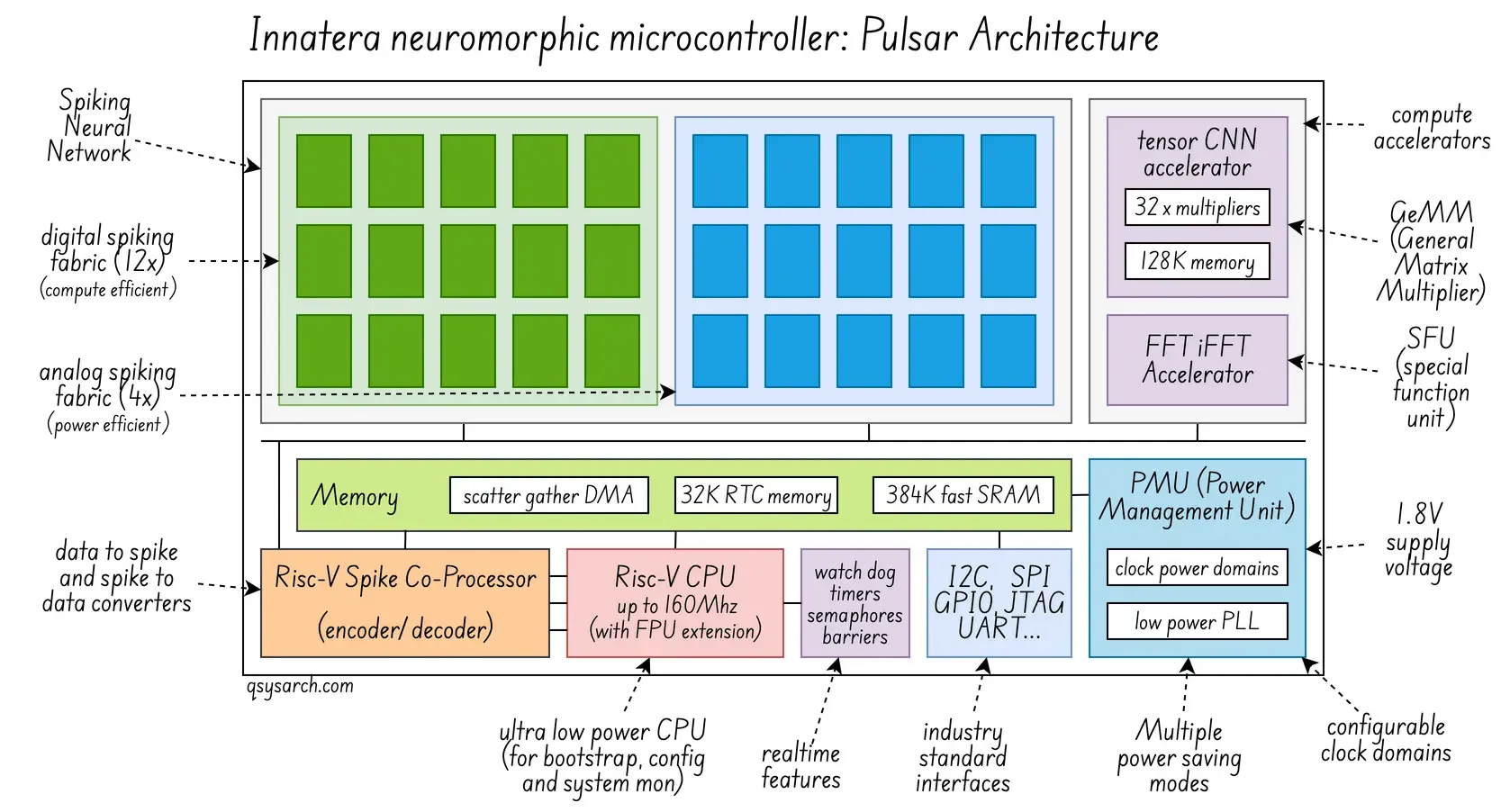 One question from the Pulsar design is: why are there two SNNs? The answer is that Innatera’s analog (proprietary analog-mixed signal) SNN fabric is optimized for maximum energy efficiency and very fast, ultra-low-power event processing. While the digital SNN fabric is a more programmable and flexible design that supports more configurable networks at slightly higher power. (Source)