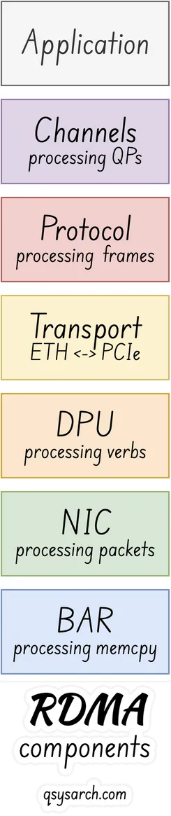 RMDA DPU: as a in-HW Verb Processor: To make the PCIe card RDMA compliant, the HW must be able to process the RDMA verbs directly into the HW, usually using a processor called the DPU.