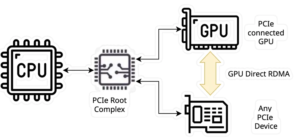 We now understand that GPU Direct RDMA, as marketed by Nvidia under the GPUNetIO umbrella, is a Network Card (NIC) based solution, which connects the GPU to the NIC over a PCIe connection. Let’s deep dive into this PCIe connection, abstract the GPUNetIO part, and refocus on the RDMA part: