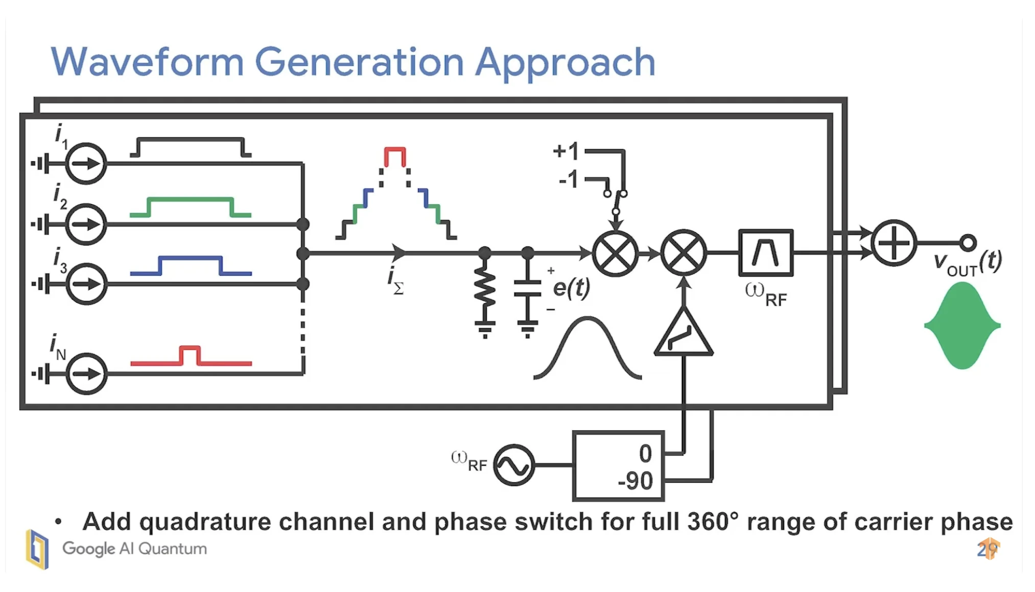 I believe the reason why Google’s architecture is not suitable for DRAG pulse is that the quadrature component would have to be scaled for both amplitude, by the factor \(\beta\), as well as for duration, with the factor \(\sigma\). I will have to confirm if this is true, but for now, we can assume that the challenge is that the pulsar needs to provide full flexibility in I/Q waveform shaping.